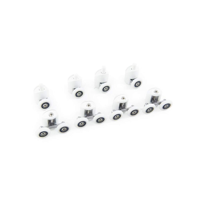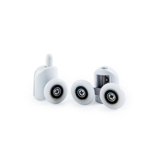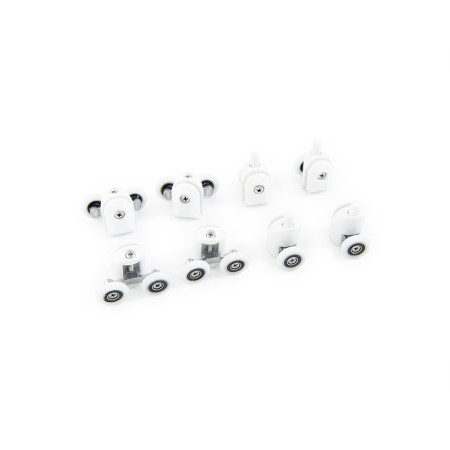 Смешанный набор роликов для душевой кабины DC 1005: одинарные и двойные ролики со съемными колесами, диаметр колесика — 25 мм. В наборе — 8 штук: 4 верхних ролика, 4 нижних. Ролики оснащены кнопочным креплением под 1 отверстие, диаметр монтажного отверстия — от 10 до 12 мм. Подходят для стекол толщиной 4-6 мм. В верхних роликах есть регулировочный винт для настройки, нижние ролики оснащены прижимной клипсой.